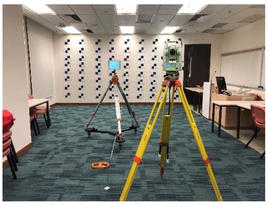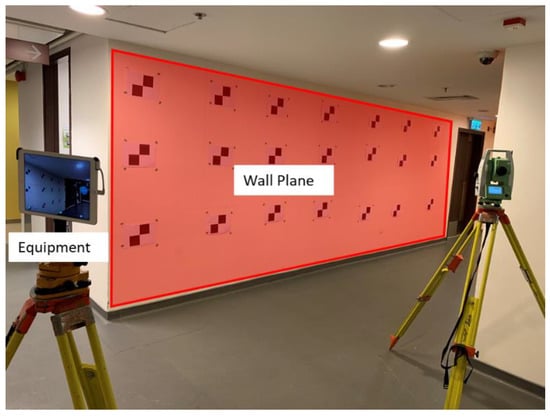 The test field and the equipment setup for the data collection are shown in Figure 10. The identifiable control points with known coordinates were distributed on the wall plane with the ground truth obtained by the total station. In our test, the dataset was captured at three different ranges—close range (1.23 m), middle range (2.47 m), and far range (4.31 m)—while the camera was arranged substantially parallel to the wall plane. Then, different cost functions, as discussed in Section 3, were used to fit the wall plane. The “true plane” parameters were obtained from the surveyed coordinates of the control points.