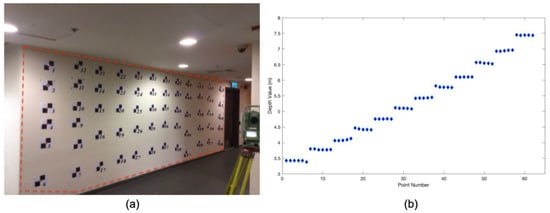 As Figure 11 shows, the basic setup of this experiment was like the first experiment. Notably, a flat wall with a height of 2.4 m and a width of 6.4 m was used as the test area, while the coordinates of the control points were surveyed using a total station with an accuracy at the millimeter-level. Then, different cost functions, as discussed in Section 3, were used to fit the wall plane. There were 62 control points on the wall (Figure 12a), and the depth measurements of the control points were in the range of 3.5 m to 7.5 m (Figure 12b).