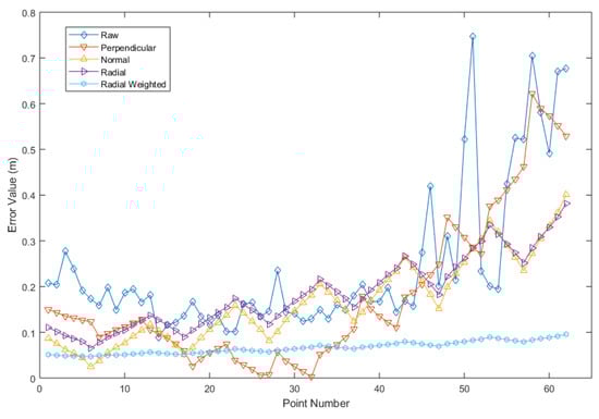 Figure 13 shows the 3D views of the fitted planes with different cost functions. It is clear that the plane, by minimizing the weighted radial residual (red area) proposed in this study, was one closer to the true plane (green area).