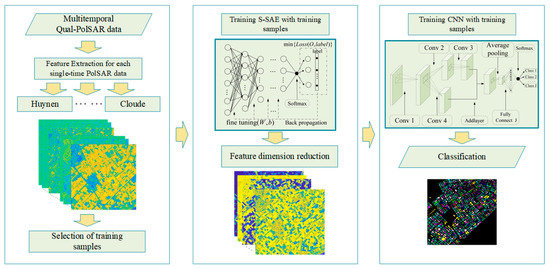 To make full use of multi-temporal PolSAR images and manage the serious problem of a “dimension disaster”, this study first employed several common scattering decomposition algorithms to extract detailed and quantitative parameters. Second, a three-hidden-layer stacked sparse auto-encoder (S-SAE) network was built to effectively extract polarimetric features and reduce the feature dimensionality. Third, the architecture of a deep CNN classifier was proposed to enhance the crop classification performance with limited training ratios. The main contribution of this paper was to apply S-SAEs to effectively reduce the feature dimension for crop classification improvements with multi-temporal, quad-pol SAR images.