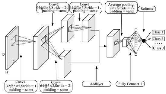 A convolutional neural network (CNN) is one of the most successful network architectures in deep learning methods. The learning process of CNNs is computationally efficient and insensitive to shifts in data like image translation, making CNN a leading model to recognize 2D patterns in images [31]. In remote sensing studies, a deep learning network based on CNN has been widely used in remote sensing, such as in large-scale image recognition, semantic segmentation, and target classification [48]. In the field of remote sensing target classification, since the ground truth data collection is always a hard task, the aim of this paper was to construct a lightweight CNN network to achieve classification results with a high accuracy and the classical LetNet was selected as the basic structure. Additionally, it is difficult to obtain better classification performance by deepening the network due to the small size of the input data cubic. Consequently, this paper promoted the LetNet configuration using two parallel branches inspired by the characteristics of GoogLeNet [55]. The proposed structure of a CNN classifier is given in Figure 5. It mainly comprises four convolutional layers, one average-pooling layer, one addlayer layer, one fully connected layer, and a Softmax classifier. Basically, it retains the same elements as GoogLeNet and utilizes the average pooling layer to reduce the number of fully connected layers. Furthermore, the network uses two convolution branches with different depths and the addlayer structure to fuse the features from different depths, enhancing the relevant features to achieve a fast convergence. The dimension of the input data is 15 × 15 × M where M indicates the number of input features. First, the input is through one convolution layer with 32 filters whose size is 5 × 5 and the stride is 1. The dimension of the generated feature cubic is 15 × 15 × 32 using zero padding. Second, the generated feature maps are fed into two pathways, where one pathway contains two convolution layers and another is one convolution layer. These three convolution layers have the same 64 filters with the same size of 3 × 3 and the strides are 2, 1, and 2. Third, the feature maps from the upper pathway are activated using a Rectified Linear Unit (ReLU) function and combined with the feature from the lower pathway. Thus, the feature maps with dimension of 8 × 8 × 64 are obtained. Fourth, the combined maps are downsampled by one average-pooling layer with the size of 2 × 2 and the stride is 2. Finally, in order to use Softmax to calculate the probability for each class, one fully connected layer is applied to map the data to a vector.
