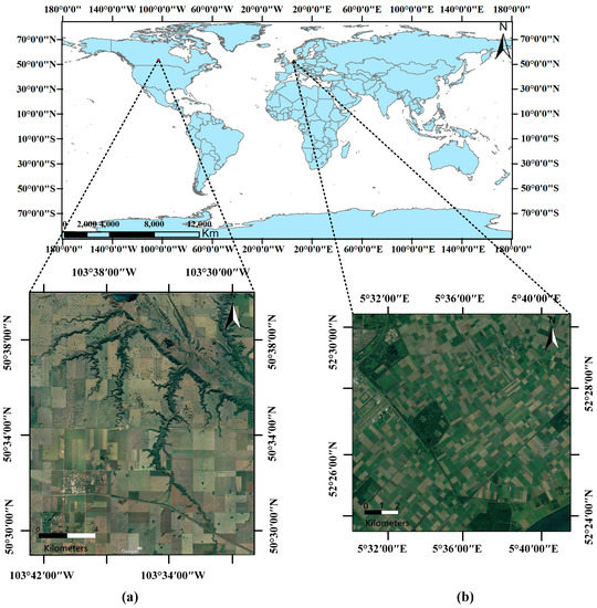 The performances of the proposed method were assessed with two data sets from two experimental sites. The first experimental site was an approximate 14 km × 19 km rectangular region located in the town of Indian Head (103°66′87.3″W, 50°53′18.1″N) in southeastern Saskatchewan, Canada [56,57]. The second one was a 13 km × 9 km rectangular region located in Flevoland (5°33′53.67″W, 52°26′45.73″N), Netherlands. The location maps of the study areas are shown in Figure 6. These two sites were established by the European Space Agency (ESA) to evaluate the performances of crop classification with Sentinel-1 data. Both study sites contained various crop types. There are mainly 14 classes of crops and the corresponding planting areas are summarized in Table 1.