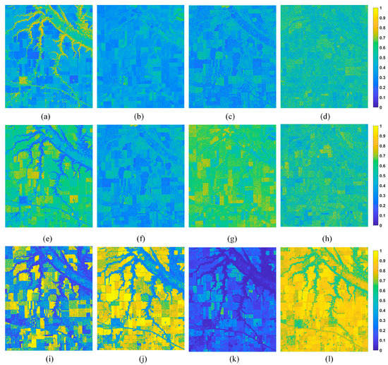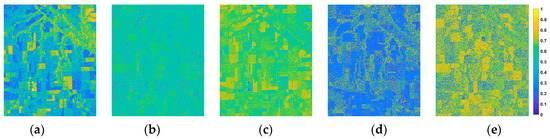 For the subsequent experiments, polarimetric scattering features were first derived from seven time-series PolSAR images separately using various methods. Some of these features were based on the measured data and directly obtained, and others were calculated with Freeman decomposition [37], Huynen decomposition [38], Yamaguchi decomposition [39], and Cloude decomposition [40]. It should be noted that the parameter “A” from Cloude decomposition was substituted by the theta parameter proposed in Ji et al. [34] and the null angle parameters were from Chen and Tao [15]. In total, 252 features from 7 time series were prepared, which are summarized in Table 2 and some typical features (i.e., amplitude of HH-VV correlation where HH and VV stands for the complex SAR images from horizontal and vertical channels respectively, phase difference of HH-VV, co-polarized ratio, and null angle parameters) are shown in Figure 8.
