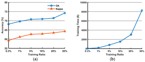 Classification accuracies and training time with different training ratios: (a) classification accuracy and (b) training time.