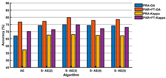 In order to investigate the performance of an S-SAE with different depths, this section sets five AEs with one to five layers (i.e., AE, S-AE2, S-AE3, S-AE4, and S-AE5), where AE is a single layer auto-encoder, S-AE is stack auto-encoder. These five S-SAEs were first pretrained, as discussed in the last section, and then finely tuned with supervised training samples. The ratios of the pretraining samples were 0.3%, 1% and 5%. The ratio of the supervised training samples for fine-tuning was set to be 1%. In order to reduce the disturbance of other parameters, , , and of the five S-AEs were all set to 0.001, 0, and 0. The number of epochs of pretraining and fine-tuning training were 400 and 800, respectively. Again, the nine reduced features were fed into the SVM classifier after the dimensionality reduction. The OA and kappa of the classification results with five different S-AEs are shown in Figure 10 (1% pretraining ratio), and the evaluation parameter values were calculated and are listed in Table 3. From Figure 10 and Table 3, it is clear to see that: 1) The accuracy of the classification results increased with the increase of pretraining samples, which is consistent with the conclusion of previous step. 2) Comparing Table 3 and Figure 9a, the parameters of , , and improved the accuracy, especially in the case of the 0.3% pretraining samples. 3) The fine-tuning of S-SAE raised the classification accuracy dramatically. However, the power of improvement became weaker with the increase of pretraining samples, which was mainly due to the insufficient training caused by the decreased ratio of fine-tuning samples to pretraining ones. 4) As the number of layers increased, the classification accuracies became gradually higher [55]. However, when the network contained more than three layers, the performance did not increase. Therefore, the network architecture of 252-100-50-9 was configured as the optimal one and used in the following experiments.