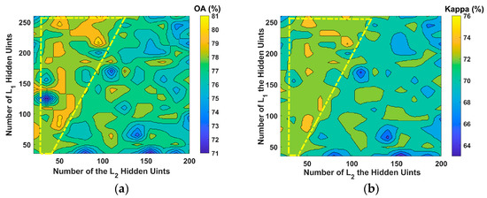 For an AE network, the number of learned features is decided by the hidden layer. To investigate the effects of the hidden layers on crop classification, a group of experiments were conducted. Here, the goal was still to reduce the 252 input features to 9, where the optimal network with the hidden neurons of 252-100-50-9 in the previous step was chosen as the original network configuration. Let and denote the number of units contained in the two hidden layers and the searching intervals were [35, 260] and [20, 200], respectively. In the experiment, the grid search strategy with a step of 15 was employed to determine the optimal number of hidden neurons. The values of , , and were still set to 0.001, 0, and 0. The nine compressed features were fed into the SVM classifiers trained with 1% supervised samples. The OA and kappa of the classification results are shown in Figure 11. From Figure 11, it is clear that the effects of the size of the hidden layer were strong. The highest OA was approximately 10% higher than the lowest. The zone with the higher classification accuracy was mainly distributed in the top-left area, appearing as an inverted triangle, marked by a yellow line in Figure 11. In this area, the optimal interval for the size of the second hidden layer shrunk gradually with the decrease of the size of the first hidden layer. Consequently, the size of the first hidden layer was much bigger than that of the second one. In addition, when the size of the first hidden layer was close to the size of the input data, a better performance of the dimension reduction was obtained, which was mainly because having more neurons could raise the ability of feature learning and improve the performance of the whole S-SAE. Finally, the best classification accuracy with an OA of 80.45% and kappa of 75.42% was achieved when and were 215 and 95, and thus the S-SAE with the structure of 252-215-95-9 was the optimal configuration.