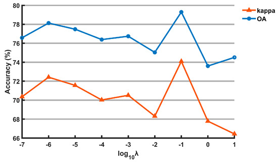 For , the grid search of was carried out with a stride of 1 and an interval of [−7, 1]. The other remaining implementation was similar with that in the previous step. The OA and kappa of the classification results with an SVM classifier are plotted in Figure 12, where the highest accuracy was obtained with a of 0.1 (i.e., ), and a of 10 generated the lowest accuracy.