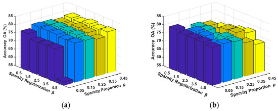 For and , two groups of experiments with a of −2 and −1 were compared. For , the searching interval and step were [0.5, 4.5] and 1. For , the searching interval and step were set to [0.05, 0.45] and 0.1. The AEs were configured with these parameters and the reduced features were fed into the SVM classifiers. The OA and kappa were charted in Figure 13, where it was evident that: 1) the values of , , and had a great impact on the recognition performances; and 2) the best results were generated when , , and were set to 0.1, 2.5, and 0.45. The highest OA and kappa were 80.62% and 75.84%, which were both 5% higher than that of an SAE with the original parameters (i.e., = 0.001, = 0, = 0). Additionally, clear regulations during the process of determining optimal parameters were not found in these experiments.