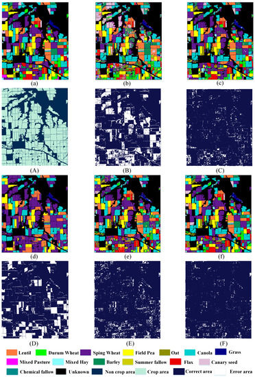 Classification results and ground truth map for the Indian Head site: (a) ground truth map, (A) crop area, (b) complex Wishart classifier, (c) Chen + CNN, (d) long short-term memory (LSTM), (e) locally linear embodied (LLE) + CNN, and (f) S-SAE + CNN. (B–F) are the error maps of (b–f).