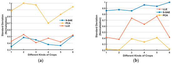 First, various dimensionality reduction methods, including PCA, LLE, a single-layer AE(1) of 252-12, a finely tuned AE(2) of 252-12, a finely tuned S-AE(1) of 252-100-50-12, a finely tuned S-AE(2) of 252-215-95-12, and an S-SAE of 252-215-95-12 were used to extract 12 low-dimension features from the original 252 multi-temporal features. In addition, the comparison methods also included a finely tuned SAE of 252-12 with , , and being 0.1, 2.5, and 0.45. The determined optimal parameters of an S-SAE of 252-215-95-12 are listed in Table 8. Compared with the ground truth, some of the classification results and the error maps are shown in Figure 17, and the OA and kappa, along with the correct classification ratio for each class, were calculated and are summarized in Table 9, from which it can be seen that the optimal S-SAE still had the best performances. The combination of the S-SAE and CNN achieved the best classification results, of which OA and kappa were up to 91.63% and 90.11%, respectively. Furthermore, the AE with a deeper structure and fine-tuning parameters improved the data dimensionality reduction ability.
