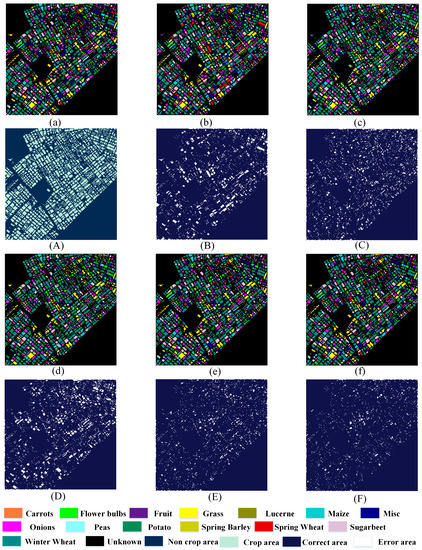 Classification results and ground truth map for the Flevoland site: (a) ground truth map, (A) crop area, (b) complex Wishart classifier, (c) Chen + CNN, (d) LSTM, (e) LLE + CNN, and (f) S-SAE + CNN. (B–F) are the error maps of (b–f).