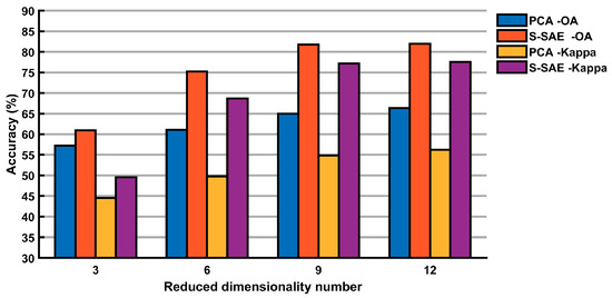 OA and Kappa of classification results by PCA and S-SAE with different reduced features.