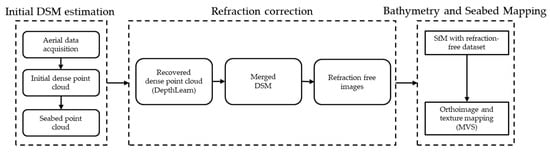 In order to correct image refraction for aerial image-based bathymetry mapping, we propose a methodology that exploits recent machine learning tools able to estimate bathymetry in shallow waters. The overall architecture of the proposed approach is illustrated in Figure 1. Following aerial image data collection and Ground Control Points (GCPs) measurement, an initial SfM-MVS is executed. The resulting initial dense point cloud with systematic depth underestimation is corrected by employing the recently developed DepthLearn solution [,] for the seabed points. The updated (merged) DSM with recovered seabed bathymetry is used to differentially rectify the initial aerial image dataset. A new SfM is finally executed based on the refraction-free imaging dataset in order to update the interior and exterior orientation of the cameras, before orthomosaicing. During the last stages, texture and orthoimages can be generated based on the merged DSM generated by the corrected dense point clouds using DepthLearn [,] and the initial dry-land points. Details for every processing step are elaborated in the following subsections.