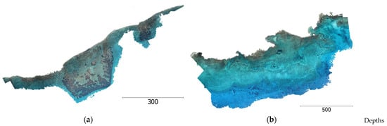 The third area used is in Cyclades, Greece, where the seabed reaches a depth of 6.9 m. The flight was executed with a Phantom 4 UAV with an FC330 camera having a 3.61 mm focal length, 1.56 μm pixel size, and 4000 × 3000 pixels. In total, 449 images were acquired from three different average flying heights of approximately 88 m, 70 m, and 35 m. A total of 14 control points measured with RTK accuracy were used, located only on land. The georeferencing was realized with RMSE of 1.45, 1.03, 1.88 cm in X, Y, and Z, respectively, and an average reprojection error of 0.28 pixels after the adjustment.
