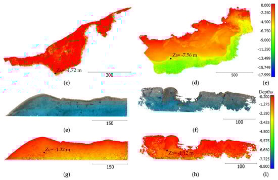 The DepthLearn [,] correction tool should be applied only to the derived seabed points. Therefore, these points were extracted from the initial cloud. To perform this extraction, the points having an elevation equal or less than the sea surface level (measured at the time of the flight with an RTK Global Navigation Satellite System (GNSS) receiver) were considered as seabed points, while the rest as dry land points. A filtering step was then applied based on a Statistical Outlier Removal (SOR) [] approach in order to remove noise from the point cloud and facilitate the creation of a more accurate DSM in the later steps. In particular, SOR is based on the distribution of point to k-nearest neighbor distances (in this paper, k = 8). For each point, the mean distance from it to all its neighbors is computed. By assuming that the resulting distribution is Gaussian with a local mean and a standard deviation, all points whose mean distances are outside an interval defined by the global distances mean and standard deviation can be considered as outliers and trimmed from the point cloud. This approach was considered necessary because image-based seabed point clouds produced using uncorrected imagery are prone to noise due to the effect of refraction on the Dense Image Matching (DIM) process, especially in deeper areas or areas with seagrass or poor texture []. In Figure 3, the seabed point clouds with natural colors (Figure 3a,b,e,f) are presented, while their corresponding bathymetry is illustrated in Figure 3c,d,g,h.