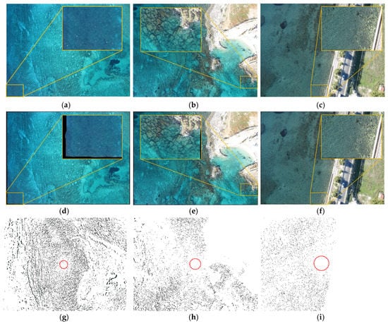 Figure 7a,b illustrates two example images from the Agia Napa dataset along with the corresponding refraction-free ones (d) and (e). In a similar way, Figure 7c illustrates an original image from the Amathounta test site together with the corresponding refraction-free image (f). Since cmixed is by default larger than cair in all depth cases because nwater > nair, an overall image shrinkage occurred, hence raw information were kept within the initial image frame, while areas with missing information due to shrinkage were kept black. This can be observed in Figure 7d–f zoomed areas. In Figure 7g–i, the differences between the respective images of the first and the second row are illustrated.