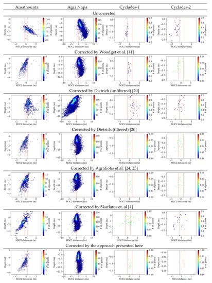 The histograms of the M3C2 distances between the ground truth and the uncorrected and corrected image-based sparse point clouds derived from the SfM for Amathounta (first column), Agia Napa (second column), Cyclades-1 (third column), and Cyclades-2 (fourth column) test sites, respectively. The dashed lines in red represent the accuracy limits generally accepted for hydrography, as introduced by the International Hydrographic Organization (IHO) []. M3C2 distances are in meters.