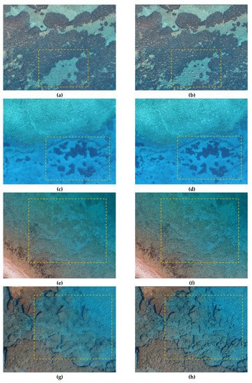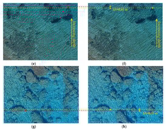 Parts of the orthoimages of Amathounta (a,b), Agia Napa (c,d), Cyclades-1 (e,f), and Cyclades-2 (g,h) test sites. In the left column, the orthoimages generated using the uncorrected imagery are presented, while in the right column, the results using the refraction corrected imagery are presented.