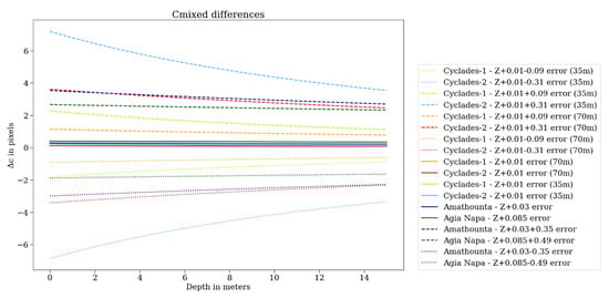 Our results suggested that the larger the depth, the smaller the differences between and . Moreover, when the standard deviation was added, the Δ calculated for the Cyclades-2 test site with a flight height of 35 m, the was affected the most by the errors present in the DSM, even though they were smaller than the errors at the Agia Napa test site. This result can be explained by the fact that the total added error in Cyclades-2 (35 m) had a greater effect on the percentages of air and water in the total light ray distance, being shallower and having a very small flight height. Excluding this test case, which was the worst, Δ was not more than 3.5 pixels in Amathounta and Cyclades-2 (70 m) test site and no more than 2.7 pixels in Agia Napa test site, while the Δ for the Cyclades-1 test site remained below 2 pixels for all the flight heights. In the typical case, Δ was not more than 0.4 pixels for all the tested cases.