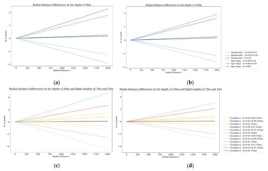 Figure 12 presents the radial distance differences Δ in relation to the radial distance r for two different depths, 50 and 15 m, for all the test sites. Solid lines represent the Δ calculated for Amathounta (in green), Agia Napa (in blue), Cyclades-1 (in cyan for 35 m flight height and in orange for 70 m), and Cyclades-2 (in light green for 35 m flight height and in red for 70 m) by adding the mean distance calculated for each site as a constant value to the hypothetical real depth. Dashed lines represent the Δ calculated by adding the mean distance and the standard deviation, while dotted lines represent the Δ calculated by adding the mean distance minus the standard deviation. That way, the maximum Δ can be calculated for each of the two tested depths. The larger the value (error) added in the real depths, the larger the radial distance differences Δ. On the contrary, by observing the results among Figure 12a–d, the deeper the point is, the smaller the radial distance differences Δ are. For example, in the Amathounta test site, presenting the larger differences between Figure 12a,b, the maximum Δ calculated for the depth of 5 m was 2.2 pixels on the edge of the image and 1.9 pixels for the depth of 15 m. For the same depths, the maximum Δ in the Agia Napa test site was calculated as 1.8 and 1.6 pixels, respectively. Coming to the typical case, Δ reached 0.2 and 0.12 pixels in the Amathounta test site, while for the same depths in the Agia Napa test site, Δ reached 0.25 and 0.23 pixels, respectively, for the radial distance of 2000 pixels, being the edge of the image. Coming now to Figure 12c,d that present the Δ over the Cyclades-1 and Cyclades-2 datasets, it is obvious that the smaller the flight height, the larger the Δ calculated, as observed also in Figure 11. For the Cyclades-1 dataset, the maximum Δ calculated for the depth of 5 m was 1.1 pixels on the edge of the image and 0.8 pixels for the depth of 15 m and flight height of 35 m; hence for flight height of 70 m, the calculated Δ was even smaller. For the same depths, the maximum Δ in the Cyclades-2 test site was calculated as 4.5 and 2.8 pixels, respectively. Coming to the typical case, Δ reached 0.18 and 0.11 pixels in the Cyclades-1 test site, while for the same depths in the Cyclades-2 test site, Δ reached 0.22 and 0.18 pixels, respectively, for the radial distance of 2000 pixels, being the edge of the image. Again, our results suggested that the larger the depth, the smaller the differences between and ’, since they clearly depend on the calculated . Similarly, the Amathounta and Cyclades-2 test sites were more affected when the standard deviation was added as a constant error, presenting Δ.