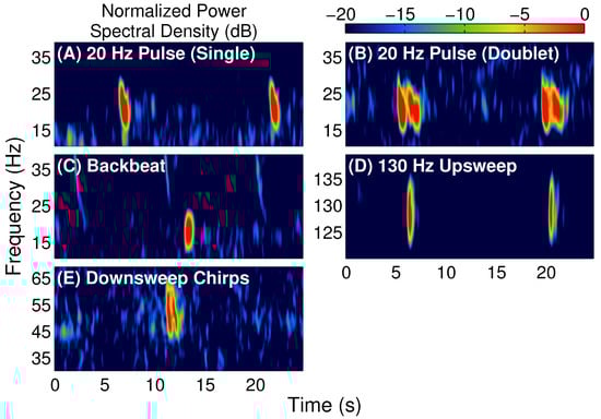 Spectrograms for the fin whale (A) 20 Hz pulse (single), (B) 20 Hz pulse (doublet), (C) backbeat, (D) 130 Hz upsweep, and (E) 30–100 Hz downsweep chirp, observed during NorEx14 using a coherent hydrophone array [].