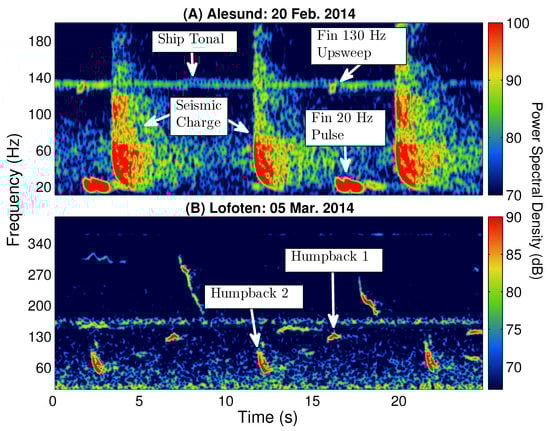 Plot (A) displays a spectrogram containing three seismic airgun signals, a ship tonal, two fin whale 20 Hz pulse (doublets), and two fin whale 130 Hz upsweeps observed off the coast of Alesund, Norway on 20 February 2014. As displayed in plot (A), the seismic airgun signal overlaps within the same frequency range as the 20 Hz pulse and 130 Hz upsweep, while the ship tonal overlaps within the same frequency range as the 130 Hz upsweep. Plot (B) displays several humpback whale vocalizations observed off the coast of Lofoten, Norway on 5 March 2014. As displayed in plot (B), the two specified humpback vocalizations overlap within the same frequency range as the 130 Hz upsweep and 30–100 Hz downsweep (See Figure 3).