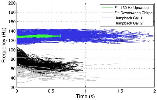One of the challenges of developing an automatic classifier for near real-time fin whale vocalization detection from acoustic spectrograms, is the ability to differentiate fin whale vocalizations from other biological and man-made acoustic sound sources. Figure 2 displays examples of several common acoustic signals and sound sources observed during the Norwegian Sea Experiment 2014 (NorEx14) [] in the frequency range of fin whale vocalizations, which include seismic airgun, ship tonal, and humpback whale vocalization signals. Unfortunately, many of these signals have overlapping features, such as bandwidth, with specific types of fin whale vocalizations that may cause ambiguity in identification. As an example, Figure 3 compares the pitch-tracks for two types of humpback whale vocalizations with the fin whale 130 Hz upsweep and 30–100 Hz downsweeps. As indicated in Figure 3, the humpback whale vocalizations appear to have some similar time–frequency characteristics as the fin whale 130 Hz upsweep and 30–100 Hz downsweeps, and it may be challenging to correctly classify these two types of fin whale vocalizations from humpback whales vocalizing in the same region, depending on the classification method utilized. Therefore, a robust classification system is necessary to enable the fin whale 20 Hz pulse, 130 Hz upsweep, backbeat pulse, and 30–100 downsweep chirp vocalizations to be recognized and differentiated from other acoustic sound sources.