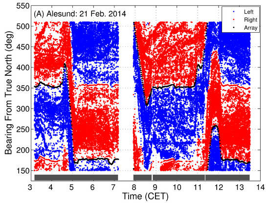Bearing-time trajectories of acoustic signal detections spanning 360-degree horizontal azimuth about the POAWRS coherent hydrophone array from true north off the coast of Alesund, Norway on 21 February 2014 within the 10 to 200 Hz frequency range. This comprises a subset of detections for the day, since there are detections in other frequency sub-bands from 200 Hz to 4000 Hz not shown here. Blue and red dots correspond to left and right side bearings, respectively, for detections about the receiver array, before the line array’s left-right bearing ambiguity resolution. The black dots represent the array heading.