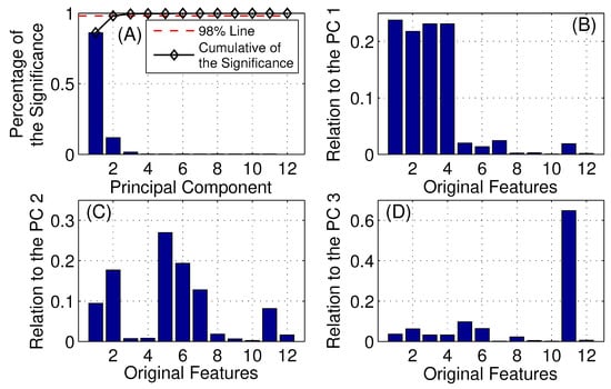 In Figure 5A, the PCs are normalized (by the sum of the eigenvalues) and ordered from highest to lowest (i.e., from most to least significant), which shows that PC1–PC3 occupies of the significance in comparison to PC4–PC12; PC1 occupies of the significance. Figure 5B–D display the normalized eigenvector components for PC1–PC3, measuring the contributions from each of the original 12 features. From Figure 5B and the significance of PC1, we find that the frequency information (original features (1–4)) provides the greatest differences across the training data set investigated. Therefore, the frequency information may have the most weight in classification performance using the logistic regression, SVM, and decision tree algorithms.