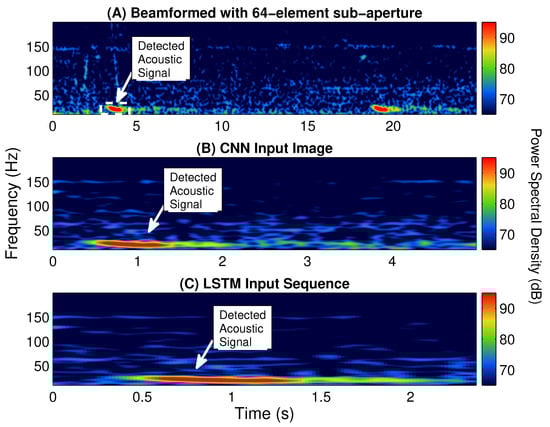 For each training and test data set example in Table 2 and Table 3, a data sequence time series was generated to train and test the LSTM classifier, constructed similarly to the images in Section 2.4.2. The time series data was constructed by first creating an matrix padded with zeros, where M is the total number of frequencies used in the beamformed spectrogram, and N is the number of time indices determined by the time duration of the acoustic signal. As a final step, the portion of the beamformed spectrogram that coincides with the frequency range and time duration of the detected acoustic signal was inserted into the matrix. Figure 6C shows an example of a data sequence time series for a single detected fin whale 20 Hz pulse. For this application, each matrix is viewed as a sequence containing M features and varies with length.