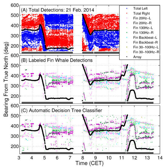 As an example for demonstrating the feasibility for using a decision tree classifier for near real-time fin whale detection applications, we will again use the POAWRS detections from the NorEx14 on 21 February 2014 (see Table 3). Figure 7A displays the bearing-time trajectory results for all the acoustic signals detected between the 10 to 200 Hz frequency range, and, again, the results visually emphasize the significant amount of POAWRS detections on this observation day. Figure 7B displays the bearing-time trajectory results from the fin whale vocalization detections that were manually labeled and visually verified by the research team (which we can treat as providing “ground truth”), whereas Figure 7C only displays the fin whale vocalization detections that were identified by the decision tree classifier. Note that it took the research team approximately 2 full days to visually inspect and verify all the fin whale vocalization detections in each spectrogram from the test data set in Table 3, whereas it only took less than one second for the decision tree classifier to classify all 43,794 detections. A comparison of the data displayed in Figure 4B,C reveals that roughly (250) of the fin whale vocalization detections were misclassified as non-fin whale (Class 6) detections by the decision tree classifier, and therefore, were not included in Figure 4C. In addition, roughly (144) of the non-fin whale (Class 6) detections were misclassified as a specific type of fin whale vocalization by the decision tree classifier, and therefore, were included in Figure 4C. Interestingly, most of the misclassified 144 non-fin whale (Class 6) detections in Figure 4C appear like random noise in contrast to the denser tracks formed by the correctly classified fin whale vocalization detections. Therefore, misclassified non-fin whale (Class 6) detections may potentially be removed by an existing density-based spatial clustering algorithm, such as Density-Based Spatial Clustering of Applications with Noise (DBSCAN) [].