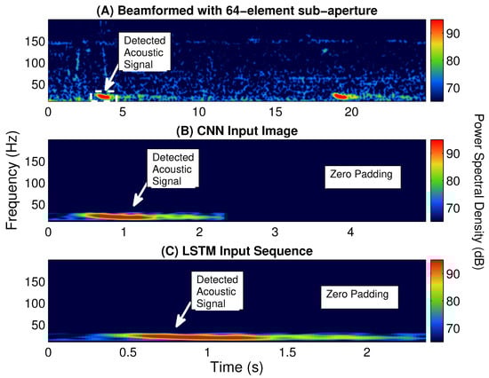 Plot (A) is an example of a beamformed spectrogram containing two fin whale 20 Hz pulses. Plot (B) and plot (C) are examples of a modified CNN input data image with zero padding and modified LSTM input data sequence with zero padding for the first 20 Hz pulse in plot (A). All the modified CNN images are defined to be 5 s in length due to hardware limitations, whereas the length of all the modified LSTM input data sequences are defined by the duration of each detected acoustic signal.