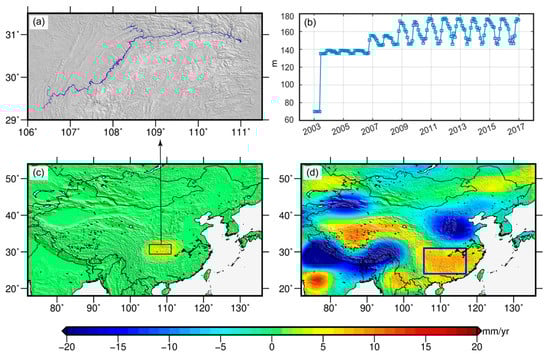 Influence of the Three Gorges Reservoir: (a) map of the reservoir; (b) the water level change of the reservoir; (c) trend of the water change from January 2003 to August 2016 after truncating the order to 60 and filtering by DDK4; and (d) mass change after removing the effects of reservoir and lakes.