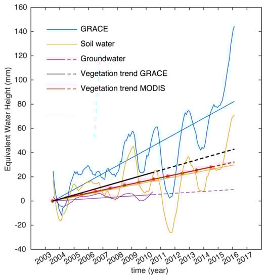 Vegetation is essential for the subsistence of all life on Earth, as it provides oxygen through photosynthesis and consumes greenhouse gases to slow the rate of global warming. Vegetation change has a large influence on water resources, and this has been highly recognized by the Intergovernmental Panel on Climate Change (IPCC) [1]. Glacial ice is the largest source of freshwater on the Earth. However, it was reported in recent studies that ice sheets and high mountain glaciers are decreasing in area in response to global warming [2,3], which will affect the global trends of freshwater availability [4]. Surface runoff is a major component of the water cycle which affects land water storage change. Wei et al. [5] found that the variation of vegetation cover has a strong effect on the annual global average variation of runoff, and the greater the forest losses, the greater the annual runoff variation. According to Bhanja et al. [6], groundwater storage change is associated with vegetation cover, because groundwater supports the growth of natural vegetation and biota. The vegetation water content (VWC) has also been widely used in agriculture and forestry studies. Chen et al. [7] reported that the change of vegetation and VWC have a positive linear relationship according to moderate-resolution imaging spectroradiometer (MODIS) data and ground-measured VWC data. The increase in vegetation will increase soil infiltration, and the high infiltration rate of water into the soil will improve soil water availability [8]. Zheng [9] found that the change of vegetation can also affect soil erosion, using field survey data from Loess Plateau in 2005. Puigdefábregas [10] found that vegetation affects the sediment fluxes in dry lands using field observations and numerical simulation experiments.