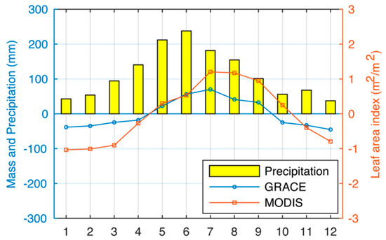 The large seasonal mass change must be related to the rainfall and the seasonal fluctuation of vegetation water content. The mean rainfall of every month in our study region is shown in Figure 5. From January to April, the region rainfall increased much more than the region’s mean mass change. This means that most part of the rainwater ran away due to the low soil water storage capacity, which may be related to the low LAI. As the LAI increases, the water storage capacity increases, and the mass increases. When the rainfall starts to decrease, the water storage capacity still increases with LAI increase in June. Thus, we speculate that vegetation has an important effect on the region’s water storage capacity, and, moreover, that it can be detected by GRACE. According to the research of Nemani and Running [43], the LAI and soil available water capacity are positively correlated, and an LAI change of 1 m2/m2 corresponds to a change of approximately 100 mm of soil available water capacity, which is consistent with our study.