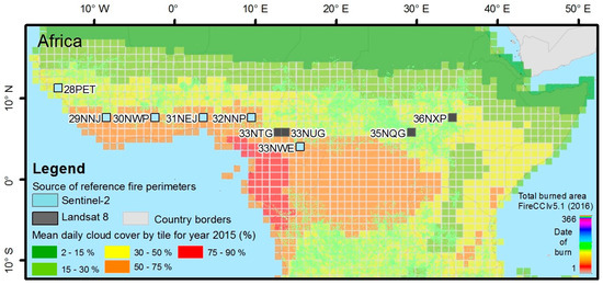 Ten Military Reference Grid System (MGRS) tiles (100 × 100 km) were used to analyse burned area agreement with reference fire perimeters derived from optical images within the 2015 and 2016 fire seasons (Figure 1 and Table 1). The tiles were selected along an east–west transect in areas with high fire activity and daily mean cloud cover below 75% to allow for the deployment of the optical-based algorithm (Figure 1). Four tiles were dominated (>75% cover) by forests. In the remaining tiles, the land cover was a mix of cropping areas, savannas, grasslands, shrublands, and forests (Table 1). The reference datasets were formed by (1) fire perimeters derived from Landsat 8 imagery (four tiles) and (2) fire perimeters derived from Sentinel-2 imagery (six tiles). Tiles with reference fire perimeters derived from Landsat imagery were selected to assess the effect of temporal discrepancy between BA detection and validation dates.