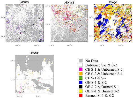 Although reference validation periods were common, the detection periods varied slightly depending on the algorithm input data (e.g., Sentinel-1, Sentinel-2), thus limiting a like for like comparison. However, general trends could be distinguished (Table 3). The Ots Sentinel-2 algorithm provided superior agreement with the reference fire perimeters when compared to the Sentinel-1 algorithms for all tiles except 33NUG, 33NQG, and 36NXP. Considering all tiles, the Ots algorithm showed OE and CE around 30% while for the radar backscatter coefficient-based algorithm (RtsB), the OE and CE were 66% and 36%, respectively. For the coherence-based algorithm (RtsC), slightly higher OE (67%) and CE (55%) errors were observed. Over all tiles, the largest difference between the three algorithms was observed for the omission errors, which were twice as much for the radar-based algorithms (66 vs. 33%). One should notice that much higher accuracies were obtained for the Ots algorithm over tiles where the validation data were generated from Sentinel-2 images (Table 3) when compared to tiles where the validation data was generated from Landsat-8 images. For the later tiles, the Ots algorithm showed OE and CE estimates in the same range as those observed for the RtsB algorithm.