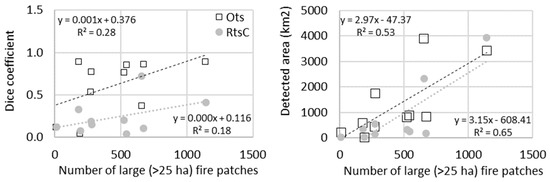 The accuracy of the radar-based algorithms was more stable with DC differences below 8% and 16% for the RtsB and RtsC, respectively. The Ots and RtsB algorithms showed a consistent pattern in regard to the location of commission errors. Such errors largely occurred over different areas (spatial agreement <6% for most tiles), suggesting potential synergies with a combined radar-optical detection method. The spatial agreement of the burned area detected by the Ots and RtsB algorithms did not depend on the total burned area but was negatively correlated with the number of large fire patches particularly when tile 33NUG was discarded from the analysis (Pearson’s r = 0.55). Notice that the Ots algorithm showed poor results (DC = 0.04) over tile 33NUG as explained above. Correlation of DC values with the number of large fire patches reached 0.52, −0.30 and 0.43 for Ots, RtsB, and RtsC respectively suggesting more accurate results with an increasing number of large fire patches for the Ots and RtsC algorithms and the opposite for the RtsB algorithm although the relationship for the latter was weak. In addition, strong correlations (>0.7) were observed between the total burned area detected by the Ots and RtsC algorithms and the number of large fire patches.