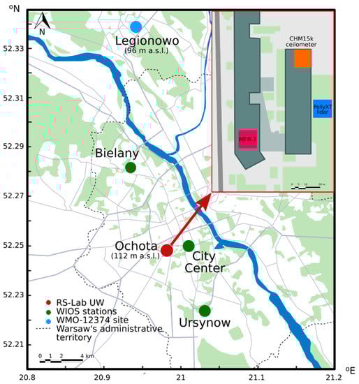 Location of the Remote Sensing Laboratory (RS-Lab) at the Ochota Campus of the University of Warsaw in the city center (in red), the World Meteorological Organization site (WMO-12374) in the small town Legionowo (in blue), and the Chief Inspectorate for Environmental Protection of Poland (WIOS) PM2.5 and PM10 monitoring stations (in green). The locations of the PollyXT lidar, the CHM15k ceilometer, and the MFR-7 shadowband radiometer at the RS-Lab at ground-based station and two roof-platforms are indicated (map provided by Olga Zawadzka-Mańko).