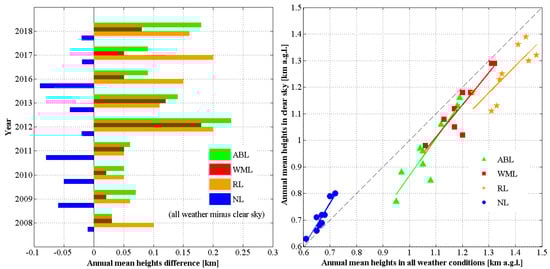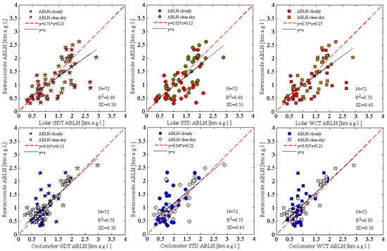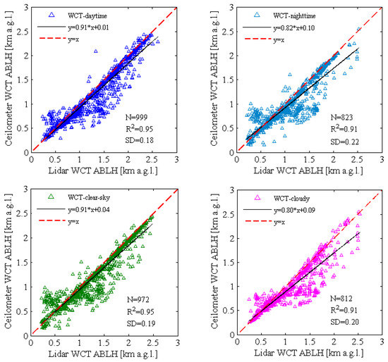 Further comparison of the ABLHs derived from lidar and ceilometer measurements under certain conditions, i.e., day versus nighttime and clear-sky versus boundary layer clouds, were performed. The results of these direct comparisons obtained with the three methods (GDT, STD, and WCT) showed consistent results, and therefore, only the results of WCT method comparison are shown in Figure 4 for brevity.