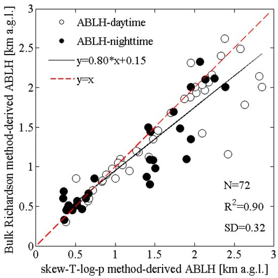 In Table 2, the results regarding the lidar and ceilometer ABLHs comparisons with the two rawinsonde retrieval methods are listed. In Figure 3, the correlation plot of ABLHs calculated using the skew-T-log-p method versus the bulk-Ri method for daytime and nighttime rawinsonde launches are plotted.