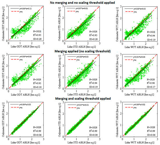 In Figure 6, bottom subfigures, the improvement of the comparison results due to an application of the proposed scaling scheme is depicted by lowering the bias significantly, i.e., to only 60 m for the GDT and WCT methods, and only slightly higher at 80 m for the STD method. The correlation coefficients are very high (0.99) for all the tested ABLH retrieval methods.