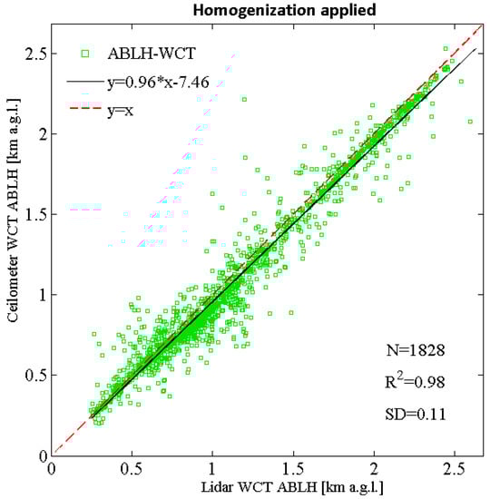 In Figure 6, the ceilometer-derived ABLHs are used to test the lidar-derived ABLHs obtained by applying the homogenization algorithm as in Equation (3). The resulting correlation coefficient of the two instruments is an R2 of 0.98, and an SD of 0.11 km was obtained. Similarly, high numbers were also obtained for the clear-sky versus cloudy conditions and the daytime (well mixed) versus nighttime (stable) (not shown for brevity). This demonstrates that the proposed method is reliable and can provide coherent results for both datasets. Therefore, it was applied to all lidar-derived ABLHs from 1 November 2013 to 31 December 2018.
