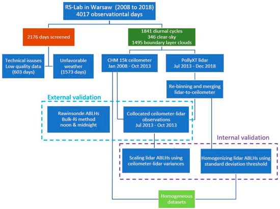 The ABLH data evaluation workflow allowing for the derivation of homogenized datasets from the PollyXT lidar and the CHM15k ceilometer observations in Warsaw.