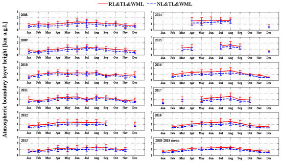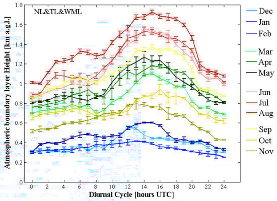 The specific aim was to derive the diurnal cycles of the ABLH, defined as starting at night, with the nocturnal boundary layer (NL), characterized by stable air with sporadic turbulence, followed (after sunrise) by a development of the well-mixed layer (WML) during the day, and after sunset, the residual layer (RL) in place of the mixed layer, and/or the stable boundary layer near the ground [1,2,3]. The boundary layer heights derived from the lidar and ceilometer data are related to the aerosol load present in the lowermost atmosphere, and therefore they do not precisely correspond to the atmospheric boundary layer height as defined therein. In comparison with the idealized definitions, the lidar and ceilometer ABLHs are derived based on an apparent aerosol load change, which occurs between the atmospheric boundary layer and the free troposphere. However, even if this relation is not simple, in this paper, it was assumed that they are proportional. The ABLH derived around sunrise and sunset was defined as the transition layer (TL). As the WML, TL, RL, and NL are related to certain times of the day, which depends on the season; their definitions are given in Table 1.