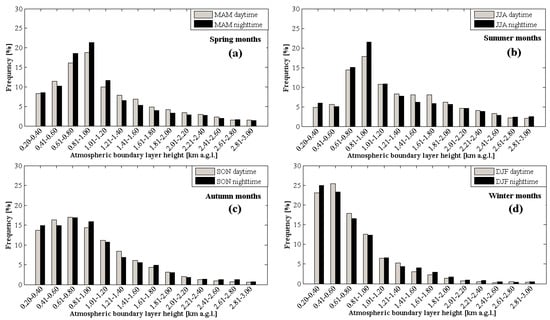 From the individual diurnal cycle data, the monthly mean diurnal cycles and the annual cycles of the ABLH, the seasonal mean ABLHs, and the annual mean NL, WML, and RL heights, as well as the daytime and nighttime ABLH frequency distribution, were derived. The time duration of daytime and nighttime per season used in this study are specified in Table 1. For comparison, the exact sunrise and sunset times are available via https://www.timeanddate.com/sun/poland/warsaw. Warsaw is located in the Central European Summer Time zone, i.e., CEST = UTC/GMT + 2 h. The daylight-saving time starts on 31 March with 1 hour forward and ends on 27 October with 1 hour back. The local time is divided to LT = UTC + 2 h (so-called local summertime) or, LT = UTC + 1 h (so-called local wintertime).