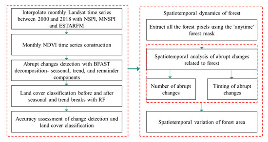Figure 2 shows an overview of the general workflow followed in this study. The monthly Landsat NDVI time series were generated by using two spatiotemporal interpolation methods named Neighborhood Similar Pixel Interpolator (NSPI) and its modified version MNSPI, and a spatiotemporal data fusion algorithm named enhanced spatial and temporal adaptive reflectance fusion model (ESTARFM). The BFAST was then adopted to detect the abrupt changes with the monthly NDVI time series. The land cover categories before and after abrupt changes were identified through setting the coefficients of the time series model as the input parameters of the RF algorithm. To determine forest extent, we created a forest mask for each image in the time series and merged these masks to produce an ‘anytime’ forest mask for extracting all the forest pixels. After accuracy assessment of change detection and classification, the spatiotemporal distributions of the number and timing of abrupt changes related to forest were analyzed. Lastly, we focused on describing the variation of forest area in West Dongting Lake and discussing the potential drivers. The critical procedures will be introduced in the following sections in detail.