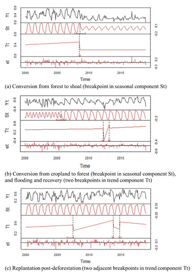 The short-term disturbances, such as flooding and replantation post-deforestation, result in conversion from forest to forest (hereinafter referred to as FTF). Although these ephemeral changes, including disturbance to forest and then recovery performed within a short term, could not result in the permanent change related to forest, such as the land cover change (FTO or OTF), they still cause short-term forest change and spatiotemporal variation of forest. Therefore, the description of flooding and replantation post-deforestation is as important as the detection of land cover changes related to forest for monitoring the spatiotemporal variation of forest in West Dongting Lake. Results calculated by using BFAST over sample areas of forestland, an area flooding (Figure 4b), or replantation post-deforestation (Figure 4c), showed that these interruptions only cause abrupt changes in the trend component. Two breakpoints (dash lines in Figure 4) closely adjacent to each other in trend component represent the disturbance (the former) and recovery (the latter), respectively. The major difference between flooding and replantation post-deforestation is whether the value of NDVI time series is greater than zero when the disturbance occurred. These results showed that the different ephemeral disturbances, even the recovery process, could also be detected and distinguished by BFAST.