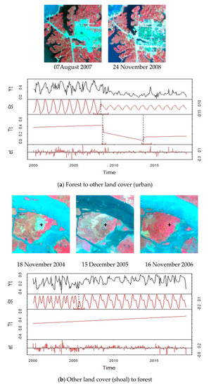 The timing errors of change detection are possibly due to the following reasons: (1) slow change; (2) reconstruction effect of time series; and (3) parameter setting of BFAST. As shown in Figure 5a, the slow urban expansion resulted in a partial forest cut within the pixel, in which this spectral change was insufficiently large to be detected by the BFAST algorithm until it was totally changed. Accordingly, the timing of change detected by BFAST was a little later (2 months) than the actual timing observed from the reference data. NSPI, MNSPI and ESTARFM algorithms interpolated the contaminated pixels and reconstructed the missing images without considering possible land cover change at that time phase, which means that the land cover category of the interpolated or reconstructed pixel with actual land cover change may have mistakenly remain unchanged at that time phase. This situation may have resulted in the land cover change detected timing delay of one or several months. We set 1 year as the minimal segment size between successive change detections in BFAST to reduce pseudo changes. However, this strategy caused the interval of two breakpoints closely adjacent to each other in the trend component, representing the short-term disturbances (such as flooding and replantation post-deforestation), to be just 1 year. In fact, the cycle of the short-term disturbances is generally less than 1 year, and it may delay the timing of the recovery process.