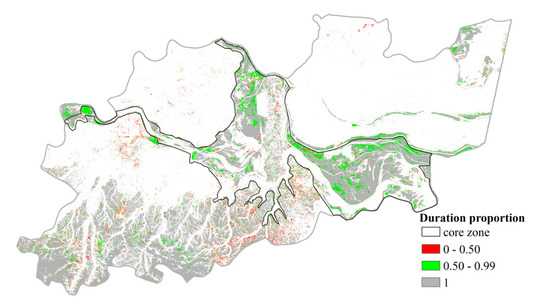 Previous studies mostly focused on the regions that are known to have been forested at the beginning of the first monitoring period and neglected the forest regions in which the forest has not been planted in the initial period [27,57], such as the pixels, the land cover of which changed from another land cover category in the initial period to forest in the later period. Considering the characteristic of frequent change between forest and the other land cover categories in West Donting Lake, we created a forest mask of each image in the time series and merged these masks to produce an ‘anytime’ forest mask for extracting all forest pixels. The distribution map of the duration proportion of forest plantation between 2000 and 2018 (Df, Table 4) is shown in Figure 6. The forests are mainly distributed in the core zone surrounding the water body and southwestern mountains. The Df of most forest regions is 1 (stable forests), whereas the rest of the forests, the Df of which are less than 1 (changed forests), are dispersedly distributed. Especially, the forest areas with Df less than 0.5 are mainly distributed in the south of the West Donting Lake region, and most changed forests with Df greater than 0.5 are concentrated in the core zone. In contrast with the forests in South China, which are mainly distributed in mountainous regions because of the limited flatlands with low elevation utilized for croplands or settlements, a large part of forests in the West Dongting Lake region are distributed in the flatlands with low elevation, except for the forests in the southwestern mountains (Figure 1e and Figure 6).